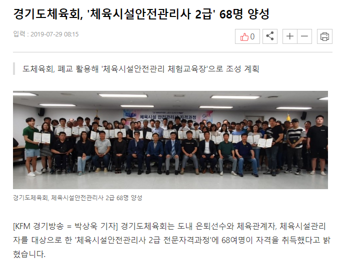 경기도체육회. '체육시설안전관리사 2급' 68명 양성